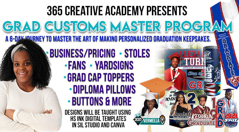 🎓 Enroll in 365 CA School of Graduation Customs Master program! A 6-day journey to the learn the art of producing the top selling custom items for grad season. Get ready to Unlock Your Creativity for Unforgettable Graduation Keepsakes!