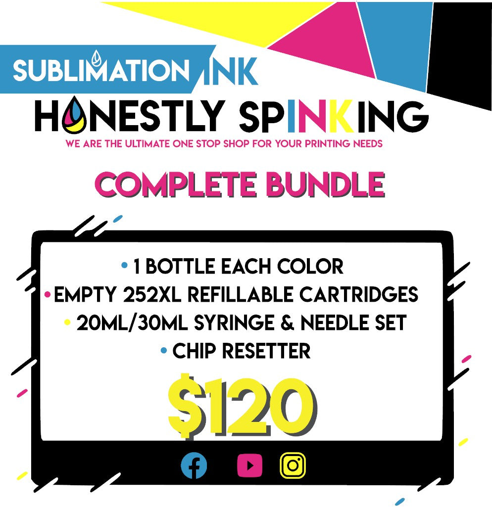 COMPLETE SUBLIMATION BUNDLE: HS Sublimation Ink 4-pack (1 bottle each of Black, Cyan, Magenta & Yellow), Set of Empty 4-Color 252 Compatible Ink Cartridges, Chip Resetter & Syringe/Needle Set - $120