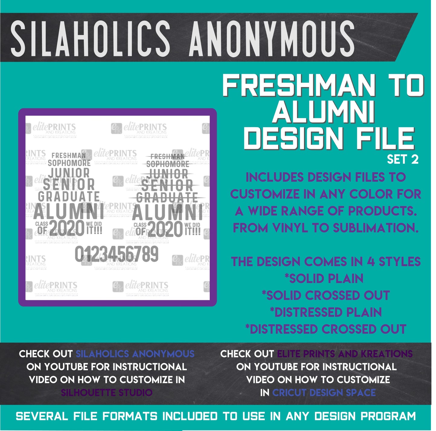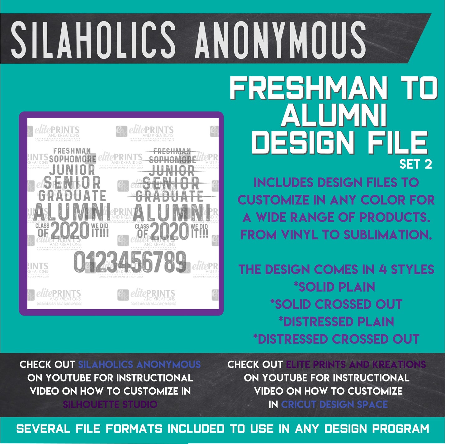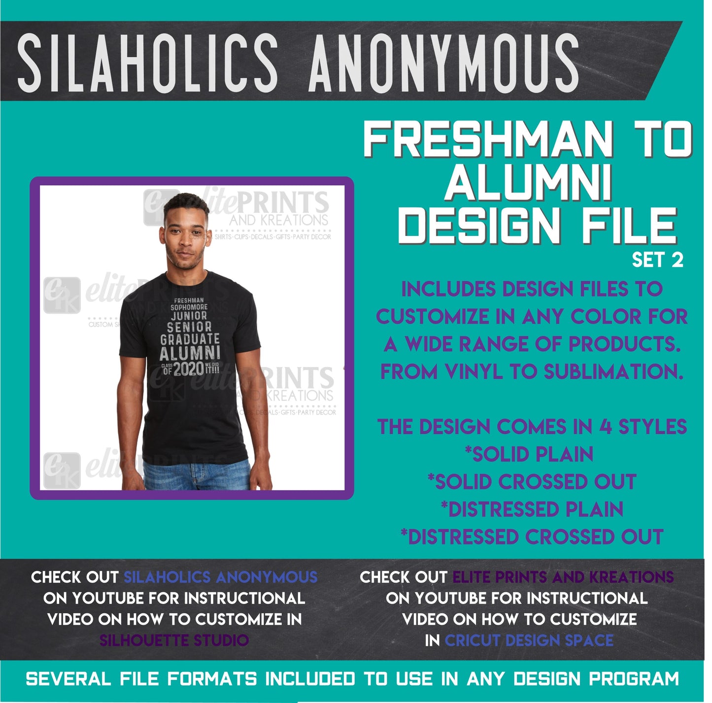 Our "From Freshman to Alumni Set 2" Design Bundle includes 2 format styles: Solid and Distressed. Each with 2 design styles Plain & Crossed out. Included in the download are file formats compatible with Silhouette Studio, Cricut DS, Illustrator, Photoshop, Corel Draw and more.